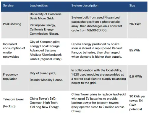 Nonetheless, there have been several successes on the second-life application as shown in the examples of storage projects using second-life EV batteries. They are used in less demanding stationary storage application as peak shaving or additional storage for renewable-based generating sources.[35]