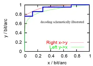 If there are two components which exchange messages, the behaviour of the decoder can be plotted on a two-dimensional chart. One component is plotted with its input on the horizontal axis and its output on the vertical axis. The other component is plotted with its input on the vertical axis and its output on the horizontal axis. The decoding path followed is found by stepping between the two curves. For a successful decoding, there must be a clear swath between the curves so that iterative decoding can proceed from 0 bits of extrinsic information to 1 bit of extrinsic information.