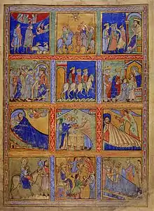 - Recto: 12 scenes completing the Nativity cycle, from the Annunciation to the Shepherds to Herod's suicide, an uncommon scene (and a medieval distortion of Josephus).