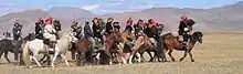 festival held in Bayan-Ölgii aimag, Mongolia.[1] In the eagle festival, Kazakh eagle hunters (Burkitshi) celebrate their heritage and compete in lure-based and timed eagle handling events with specially trained golden eagles, showing off the skills both of the birds and their trainers (said skills may not necessarily translate to actual hunting prowess: See explanatory information below in paragraph starting with the words "Despite the above-noted descriptions" ). Prizes are awarded for speed, agility and accuracy, as well as for the best traditional Kazakh dress, and more.[2][3]