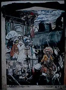 Local familiarity with Mexican cultural history led to artworks which took on distinctive Mexican themes and characters and which paid tribute to the subtleties of the Mexican culture - from Lucha Libre and Mexico's love of free-wrestling to “Día de los Muertos” (Day of the Dead), which is a Mexican national holiday to celebrate, pray for, and to honor departed loved ones. Such artworks include Mays' "The Dead Dance", which conveyed the Mexican dead celebrating in skeletal forms. His “Last Train to Chihuahua”, which depicts a revolution-era train arriving at a station, received wide coverage in local newspapers, and “The Birth of The Mestizo”, combine many elements of pre-Hispanic Mexican Aztec culture's encounter with the Conquistadores, and the resulting post-Hispanic Mexico - where the eagle perched on cactus devoured the snake, which today, remains a part of the Coat of arms of Mexico