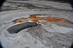 Ear Spring is a hot spring in the Upper Geyser Basin of Yellowstone National Park in the United States. Located close to Old Faithful, on rare occasions Ear Spring will erupt as a geyser, and can shoot rocks and debris as well as water more than 25 feet (7.6 m) for a few minutes. On September 15, 2018, Ear Spring was seen on the National Park Service webcam at Old Faithful erupting for a minute and reached heights of 20 to 30 ft (6.1 to 9.1 m). This was the largest eruption the pool may have had since 1957.[2] The eruption tossed small rocks out and the heated water killed the surrounding bacterial mats that normally thrive in less heated conditions. Likely related to the eruption of Ear Spring, a new thermal feature opened up under the pedestrian boardwalk near Pump Geyser which resulted in the National Park Service temporarily closing off the boardwalk. This new thermal feature was spouting water the night of September 18-19, 2018. Additionally, Doublet Pool and North Goggles Geyser have both been more active in the period immediately after the rare eruption of Ear Spring.[2]