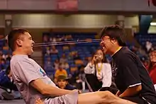 The ear pull is a traditional Inuit game or sport which tests the competitors' ability to endure pain,[1] and also strength. In the ear pull, two competitors sit facing each other, their legs straddled and interlocked. A two-foot-long loop of string, similar to a thick, waxed dental floss, is looped behind their ears, connecting right ear to right ear, or left ear to left ear.[1] The competitors then pull upon the opposing ear using their own ear until the cord comes free or the opponent quits from the pain.[1] The game has been omitted from some Arctic sports competitions due to safety concerns and the squeamishness of spectators;[2][3] the event can cause bleeding and competitors sometimes require stitches.[1]