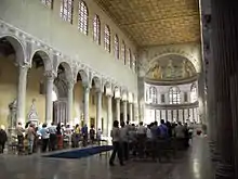 The usable model at hand, when Emperor Constantine I wanted to memorialize his imperial piety, was the familiar conventional architecture of the basilica. There were several variations of the basic plan of the secular basilica, always some kind of rectangular hall, but the one usually followed for churches had a center nave with one aisle at each side, and an apse at one end opposite to the main door at the other. In, and often also in front of, the apse was a raised platform, where the altar was placed and the clergy officiated. In secular buildings this plan was more typically used for the smaller audience halls of the emperors, governors, and the very rich than for the great public basilicas functioning as law courts and other public purposes.[33]