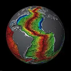 Recycling of existing primordial crust contributes to the production of secondary crust. Partial melting of the existing crust increases the mafic content of the melt producing basaltic secondary crust.[14] A further method of formation due to the decay of radioactive elements within the Earth releasing heat energy and eventually causing the partial melting of upper mantle, also producing basaltic lavas.[15] As a result, most secondary crust on Earth is formed at mid ocean ridges forming the oceanic crust.