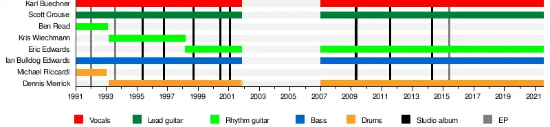 Earth Crisis is an American hardcore punk band from Syracuse, New York, active from 1989 until 2001, reuniting in 2007. Since 1993 the band's longest serving members are vocalist Karl Buechner, lead guitarist Scott Crouse, bassist Ian Edwards and drummer Dennis Merrick. Their third and current rhythm guitarist Erick Edwards joined the band in 1998.[3][2]