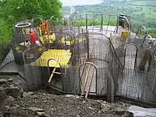 The in-hill (also termed "earth covered",[2] or "elevational")[4] construction is where the earth shelter is set into a slope or hillside, and earth covers the roof in addition to the walls.[2] The most practical application is using a hill facing towards the equator (south in the Northern Hemisphere and north in the Southern Hemisphere), towards the aphelion (north) in the Tropics, or east just outside the Tropics. There is only one exposed wall in this type of earth sheltering, the wall facing out of the hill, all other walls are embedded within the earth/hill. This is the most popular and energy efficient form of earth shelter in cold and temperate climates.[5][14]