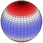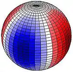 The semi-diurnal tide (one maximum every 12 or so hours) is primarily lunar (only S2 is purely solar) and gives rise to sectorial (or sectoral) deformations which rise and fall at the same time along the same longitude.[1] Sectorial variations of vertical and east-west displacements are maximum at the equator and vanish at the poles. There are two cycles along each latitude, the bulges opposite one another, and the depressions similarly opposed. The diurnal tide is lunisolar, and gives rise to tesseral deformations. The vertical and east-west movement is maximum at 45° latitude and is zero on the equator and at the poles. The tesseral variation has one cycle per latitude, one bulge and one depression; the bulges are opposed (antipodal), in other words the western part of the northern hemisphere and the eastern part of the southern hemisphere, for example. Similarly, the depressions are opposed, in this case the eastern part of the northern hemisphere and the western part of the southern hemisphere. Finally, fortnightly and semi-annual tides have zonal deformations (constant along a circle of latitude), as the Moon or Sun gravitation is directed alternately away from the northern and southern hemispheres due to tilt. There is zero vertical displacement at 35°16' latitude.