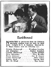 Earthbound is an American silent drama film from Goldwyn Pictures Corporation that was released on August 11, 1920. The film was written by Edfrid A. Bingham from a story by Basil King, and directed by T. Hayes Hunter. Earthbound was produced by Basil King with cinematography by André Barlatier, film editing by J.G. Hawks and art direction from Cedric Gibbons.[1] The plot involves the character Daisy Rittenshaw, whose husband murders her lover when he discovers their affair. Her lover's ghost remains, unable to move on until he helps those whom he has wronged.
