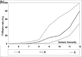 The probability that a building of a given type may collapse if subjected to a certain intensity of shaking (Figure 5) is an important parameter for calculating expected human losses. The weak buildings that are present in developing countries (Figure 4 on the left) are the ones that are likely to collapse at moderate intensities (Figure 5 on the left).