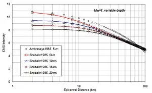 Errors are again introduced through the heterogeneity of the Earth. The loss of energy along the wave path is not exactly the same in all parts of the world.[25][26] Examples are shown in Figure 2. For poorly studied regions in developing countries, the uncertainty of the estimated intensities can be substantial, as shown by the different curves, because attenuation is poorly known.