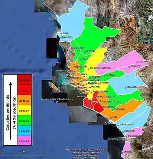 In many large cities, the census contains information on population and building stock by district. A model of a city in which each district has its own distribution of buildings into classes and its population, is far superior to the basic, primitive model of one coordinate point. If one has the resources to divide a large city into neighborhoods containing similar building stock, then a high quality model can be constructed at a still moderate cost. An example of the mortality rate estimates in case of a future M8 earthquake off Lima, Peru, shows that there are substantial differences between districts (Figure 9).[38] The differences are due to the distance from the assumed source, the type of soil, and the quality of the building stock. In addition to the mortality calculation for the entire population, information on the locations and expected damage state of schools, hospitals, fire stations, police posts, and critical facilities would be of great value for rescuers. However, to develop this type of information requires a more substantial effort in countries where the location and construction quality of these facilities are not known.