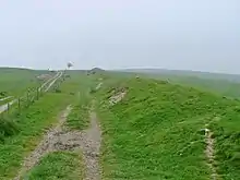 Shallow earthworks are often more visible as cropmarks or in aerial photographs if taken when the sun is low in the sky and shadows are more pronounced.[16] Similarly, earthworks may be more visible after a frost or a light dusting of snow.[17]