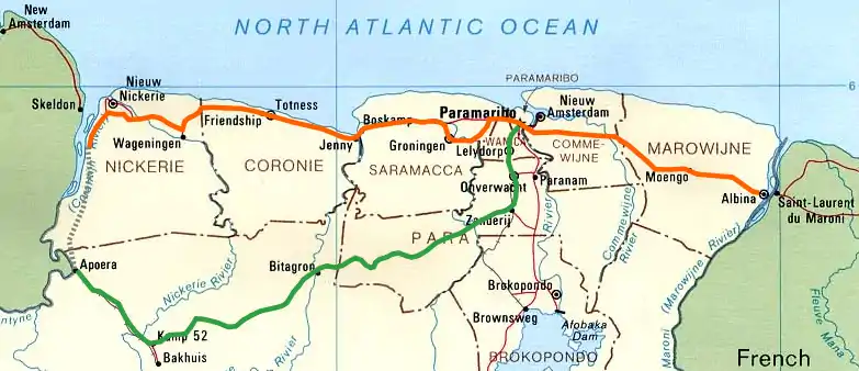 The East-West Link has a ferry connection with Guyana on the western side since 1998, connecting South Drain with Moleson Creek.[14] In the east there has been a ferry between Albina and Saint-Laurent-du-Maroni in French Guiana since 1969.