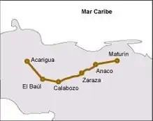 As part of a National Rail Development Plan, most of the East-West railway was incorporated in a planned standard gauge 290 mi (470 km) Tinaco-Anaco railway,[1] inaugurated with Chinese funding in 2009. About a fifth of the work had been done by 2012.[1] However, it appears construction stalled in 2013,[2] though the route remains on the State Railways Institution's map of railways under construction.[3]