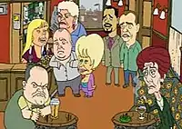 An episode of Two Pints of Lager and a Packet of Crisps entitled "War, Hurrgh!" contains references to Peggy and Grant Mitchell, Angie Watts and Pat Butcher. The episode also ended with the same theme music as EastEnders. Another episode, "Speedycruise!" referred to Pauline and Martin Fowler, and the episode "Finger Sniffing" also refers to Peggy. Also, in the episode "When Janet Met Johnny", Donna sings the line "Don't stay in watching EastEnders." Also, in an episode of Pulling, the character of Donna asks "Who am I going to tell when I have an idea for a new plotline in EastEnders?".