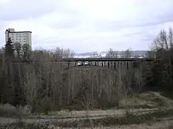 The East 34th Street Bridge is a concrete open-spandrel bridge in Tacoma, Washington. The bridge was built in 1937 to replace a wood bridge that had previously spanned the gulch. The bridge is constructed of two rib arches, that are supported by 24-foot (7 m) support legs, with spandrel columns between the arches and the bridge's 485-foot (148 m) deck. The concrete railings on the deck are adorned with urn-shaped lampposts.[2]
