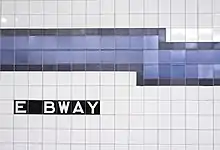 The tile band is medium Parma violet with a slightly darker border, set two tiles high. Tile captions below show the station name abbreviated as "E BWAY" in white letters on black. The I-beam columns are painted a similar shade of dark violet. The trackside walls showed a considerable pattern of aging and occasional water damage prior to the station's renovation, which replaced all the tiles and remained mostly faithful to the original design.
