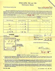 The Tithe Acts of 1936 and 1951 established the compulsory redemption of English tithes by the state where the annual amounts payable were less than £1, so abolishing the bureaucracy and costs of collecting small sums of money. This applied to East Dundry as elsewhere.