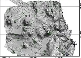 ![]() Shaded relief map of the Epi caldera; Epi-A, Epi-B and Epi-C are marked. | |