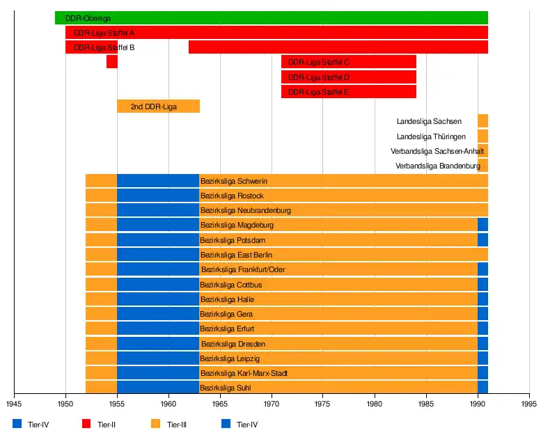 For most of its history, competitive GDR football was divided into three tiers. The Oberliga was founded in 1949, and served as GDR football's highest tier of competition throughout the country's existence.[1]