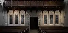 The chancel windows were designed by Wilbur Herbert Burnham of Boston, Massachusetts. The windows depict scenes of the life of Christ from the entry into Jerusalem to the Ascension. These scenes are purposefully not placed chronologically so that they cannot be viewed within the sequence of events as found in Gospel accounts. Four small rose windows highlight the importance of music in worship and portray King David (Psalmist), Giovanni Pierluigi Palestrina, Pope Gregory I (Gregorian chant), and Johann Sebastian Bach.[3]