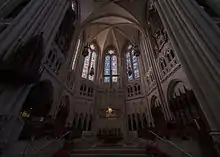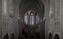 The large rose window in the east transept, the two small rose windows above the chancel organ cases, and the two small rose windows in each transept are by the D'Ascenzo Studios of Philadelphia. The large window depicts the Revelation 21; the figure of a woman representing the Holy City, the New Jerusalem.[3]