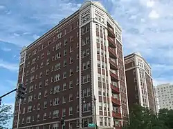 The East Park Towers are a historic apartment building at 5236-5252 S. Hyde Park Boulevard in the Hyde Park neighborhood of Chicago, Illinois. The building was constructed in 1922-23 during a period of residential growth in Hyde Park. While it had no guest rooms, the apartments offered similar amenities to an apartment hotel, such as housekeeping service. Apartment hotels were popular as part-time housing for wealthy workers, as they combined the amenities of in-home service with the affordability of apartments, and the East Park Towers were one of several such apartments built in Hyde Park at the time.[2] Architect William P. Doerr designed the building in the Georgian Revival style; his design included terra cotta belt courses and quoins and Palladian windows on the first floor.[3]