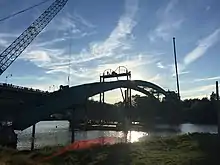The predecessor to the current bridge was located in Sheet Harbour, in the eastern area of the Halifax Regional Municipality, along the Eastern Shore. It was a green steel arch bridge, and was built in 1956 over the Northeast Arm of Sheet Harbour. It had a half-through, two-hinge type arch, as well as a built-up box-cross section for support.[5][6] The bridge was 213 metres (699 ft) in length, with a main span of 140 metres (460 ft).[1][5] The bridge had engineering ties with the Angus L. MacDonald Bridge in Halifax. The deck carried the two lanes of Trunk 7 and by extension the Marine Drive scenic route, and was hung from the arch by vertical steel wide flange shape hangers. The ribs of the bridge were heavily reinforced in 1988.[6] As the bridge neared the end of its lifespan, it was replaced by a new bridge with the same name. Unlike the old bridge, the new bridge was designed without overhead steel arches that would have doubled the cost.[3]