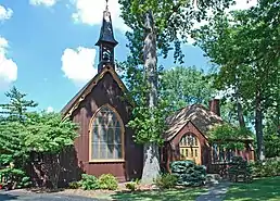 The resulting church is a front-gable, Carpenter Gothic frame structure.[12] The walls a vertical board and batten, and pierced bargeboards line the gables.[12] The entrance is located on one side under a gable, and a frame steeple tops the church.[12] The building has stained glass lancet windows, including the 1898 Tiffany window, Angel of Praise, which measures 11 feet by five-and-a-half feet.[13] In the years since its construction, the church has undergone several repairs and had multiple additions, but the main structure remains substantially original and in excellent condition.[12] The red doors of the structure are dedicated to the memory and benevolence of Lisette Denison Forth.[11]