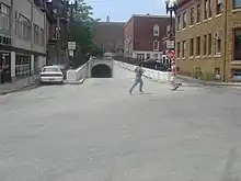 ![]() The east portal of the tunnel opens onto Thayer Street, with Brown University buildings visible in the background (2005) | |