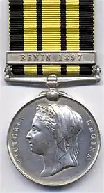 The East and West Africa Medal, established in 1892, was a campaign medal awarded for minor campaigns that took place in East and West Africa between 1887 and 1900. A total of twenty one clasps were issued.[1]