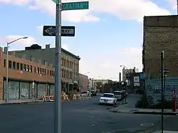 On April 18, 1835, the village of Williamsburg was extended eastward to Bushwick Avenue and to Flushing Avenue on the Southeast (then known as Newtown Road). The region that is now circumscribed on the west by Union Ave, on the south by Broadway, then along Flushing Avenue to Bushwick Avenue on the east and on the north (approximately) by the Newtown Creek was designated as the Third District of the Village of Williamsburg in 1835.[6] At this time, the three districts of Williamsburg were more commonly known as the North Side, South Side, and the New Village. The names "North Side" and "South Side" remain in common usage today, but the name for the Third District has changed often. The New Village became populated by Germans and for a time was known by the sobriquet of "Dutchtown". In 1844, Williamsburg separated from the Town of Bushwick and became the Town and Village of Williamsburg. Parts of the Third District were known as "Irish Town" and "The Green" during the latter half of the 19th century.[4]