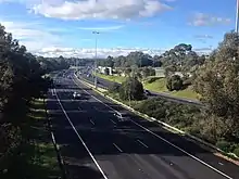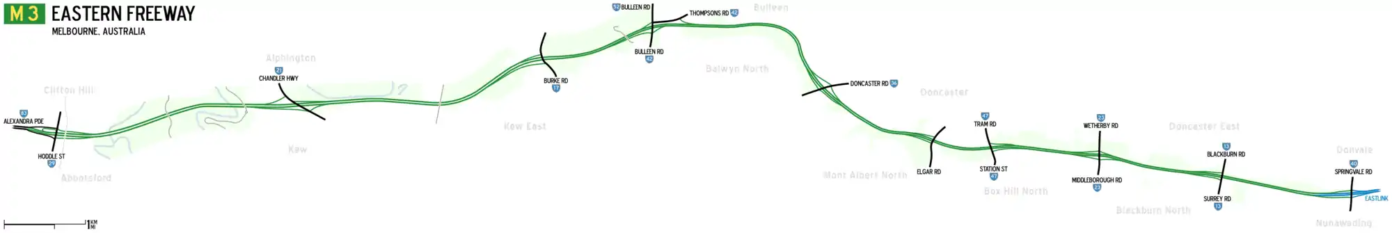 The Eastern Freeway[2] is an urban freeway in eastern Melbourne, the state capital of Victoria, Australia. It is one of the most important freeways in terms of commuting to the city, connecting Alexandra Parade and Hoddle Street in the inner suburbs, with EastLink tollway farther east. It consists of between three and six lanes (including the Hard Shoulder Running lane during peak periods) in each direction, also an inbound transit lane reserved for vehicles with two or more occupants during peak hours.