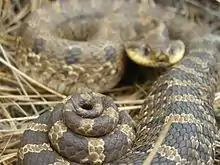 The eastern hog-nosed snake[3] (Heterodon platirhinos), also known as the spreading adder[4] and by various other common names, is a species of mildly venomous rear-fanged snake in the family Colubridae. The species is endemic to North America.[5] There are no subspecies that are recognized as being valid.[3]