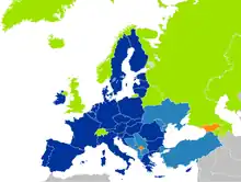 The Eastern Partnership (EaP) was established as a specific Eastern dimension of the European Neighborhood Policy, which contains both a bilateral and multilateral track.[6] The Eastern Partnership complements the Northern Dimension and the Union for the Mediterranean by providing an institutionalised forum for discussing visa agreements, free trade deals, and strategic partnership agreements with the EU's eastern neighbours, while avoiding the controversial topic of accession to the European Union. Its geographical scope consists of Armenia, Azerbaijan, Belarus, Georgia, Moldova, and Ukraine.[7] Unlike the Union for the Mediterranean, the Eastern Partnership does not have its own secretariat, but is controlled directly by the European Commission.[8]