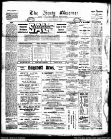 The Observer was first published in 1906 using equipment bought from The Border Post, and Wodonga Advertiser, an Albury newspaper which had ceased operation in 1902.[1][2] It was also titled The Henty observer and Culcairn Shire register and Shire's observer.[1] The press moved a number of times in Henty until, after a fire destroyed its premises in 1933, a new building was constructed. The paper continued to be based from this building until 2008, when it was converted to a museum.[2][3] In 1981 it changed name to the Eastern Riverina Observer and remained in publication under this title until 2003.[4]