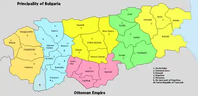 Eastern Rumelia consisted of the departments (called in Bulgarian окръзи okrazi, in Ottoman terminology sanjaks) of Plovdiv (Пловдив, Filibe), Tatarpazardzhik (Татарпазарджик, Tatarpazarcığı), Haskovo (Хасково, Hasköy), Stara Zagora (Стара Загора, Eski Zağra), Sliven (Сливен, İslimye) and Burgas (Бургас, Burgaz), in turn divided into 28 cantons (equivalent to Bulgarian околии okolii, Ottoman kazas).[9]