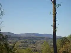 The Blue Ridge section comprises the western section of the Blue Ridge Province, the crests of which forms most of the Tennessee-North Carolina border. At an average elevation of 5,000 feet (1,500 m) above sea level, this physiographic province contains the highest elevations in the state.[8] The Blue Ridge region is subdivided into several subranges— the Iron Mountains, Unaka Range,[lower-alpha 2] and Bald Mountains in the north, the Great Smoky Mountains in the center, and the Unicoi Mountains and the Little Frog and Big Frog Mountain areas in the south.[9] Clingmans Dome, at 6,643 feet (2,025 m), is the state's highest point, and is located in the Great Smoky Mountains along the Tennessee-North Carolina border.[8] Most of the Blue Ridge section is heavily forested and protected by various state and federal entities, the largest of which include the Great Smoky Mountains National Park and the Cherokee National Forest.[10] The Appalachian Trail enters Tennessee in the Great Smoky Mountains, and roughly follows the border with North Carolina most of the distance to near the Roan Mountain, where it shifts entirely into Tennessee.[11]