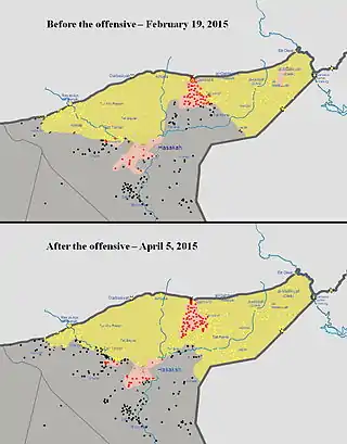 The Eastern al-Hasakah offensive was launched in the Al-Hasakah Governorate during the Syrian Civil War, by the Kurdish-majority People's Protection Units, Assyrian Christian militias, and allied Arab forces against the jihadist Islamic State of Iraq and the Levant (ISIL or ISIS), with the intent of retaking the areas of the Jazira Canton that had been captured by ISIL.[2] Subsequently, the Syrian Armed Forces also launched an assault against the jihadists, without coordinating with the YPG.[25]