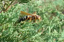 Sphecius speciosus, often simply referred to as the cicada killer or the cicada hawk, is a large, solitary digger wasp species in the family Crabronidae. The name may be applied to any species of crabronid that preys on cicadas, though in North America, it is typically applied to this species, also referred to as the eastern cicada killer in order to further differentiate it from the multiple other examples of related wasp species. Sometimes, they are called sand hornets,[1] although they are not hornets, which belong to the family Vespidae. This species can be found in the Eastern and Midwest U.S. and southwards into Mexico and Central America. They are so named because they hunt cicadas and provision their nests with them. Cicada killers exert a measure of natural control on cicada populations, and as such they may directly benefit the deciduous trees upon which the cicadas feed.
