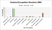 In 1881, male and female occupations drastically differentiated as 16 males worked in Agriculture and 16 females worked in Unknown Occupations. Therefore, Agriculture was the most popular occupation for males and Textile Fabrics / Dress was the most popular known occupation for females as it provided them with 6 jobs.[18]