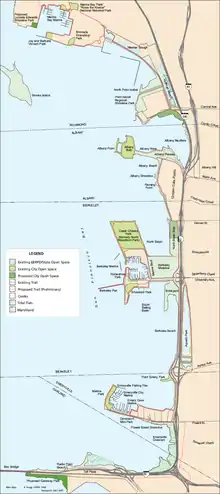 McLaughlin Eastshore State Park is a state park and wildlife refuge along the San Francisco Bay shoreline of the East Bay between the cities of Richmond, Albany, Berkeley, Emeryville, and Oakland. It encompasses remnant natural wetlands, restored wetlands, as well as landfill west of the Eastshore Freeway. Its shoreline is 8.5 miles (13.7 km) long, and its total area is 1,854 acres (750 ha), which includes both tidelands and uplands.[1] Originally named just Eastshore State Park, it was renamed in October 2012 to honor the late Save the Bay founder Sylvia McLaughlin,[2] who, along with the late Dwight Steele of Citizens for Eastshore Park (now Citizens for East Shore Parks), drove the establishment of the park. Prior to 2013, it was jointly managed by the California State Parks and East Bay Regional Park District (EBRPD). The state agency and EBRPD executed a 30-year agreement for EBRPD to manage the park.[3]