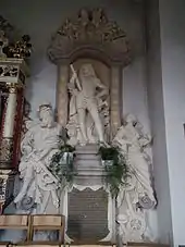 Eberhard Friedrich's grave monument in the Protestant church in Neidenstein, which includes a life-size statue of him, was probably made by Heinrich Charrasky, who also made the statue on the Haus zum Riesen. The monument is flanked by statues of the war god Mars and the hunting goddess Diana, reflecting von Venningen's interests in war and hunting. The dedication gives Venningen's title as: