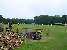Ebernoe Horn Fair is held in the small Sussex village of Ebernoe, the location of which is about five miles north of Petworth (grid reference SU975280). The fair is held annually on Saint James's Day, 25 July. The tradition is centuries old though it appears to have been revived in 1864 after a long lapse. The celebration is held on the village common and the main attraction is a cricket match between Ebernoe and a nearby village. Towards the end of the day the highest scoring batsman is presented with a set of horns. These are taken from a sheep which has been roasted during the day. It is thought the presentation of horns is associated with the custom of dressing up with horns as a symbol of cuckoldry (a cuckold is an old English term for a man whose wife has had an adulterous affair. It relates to the cuckoo, a bird which lays its eggs in another bird's nest). Centuries ago horn fairs were boisterous events where cuckoldry and seduction would not be unknown. The practice of dressing up with horns is alluded to in the traditional Horn Fair Song.[1] The old saying All's fair at Horn Fair probably originates from such events. In days gone by it seems that Ebernoe Fair was often beset by thunderstorms. However, the storms were taken as a good luck sign and farmers would look forward to a good harvest. The absence of a storm would suggest the crops would fail. Ebernoe Horn Fair was also the day on which gardeners were reminded to sow their spring cabbages.