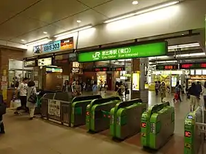 Ebisu Station (恵比寿駅, Ebisu-eki) is a railway station in the Ebisu neighborhood of Tokyo's Shibuya ward, operated by East Japan Railway Company (JR East) and the Tokyo subway operator Tokyo Metro. The station is named after Yebisu Beer, which was once brewed in an adjacent brewery, and which is itself named for the Japanese deity Ebisu.