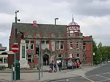 In addition to the Liverpool and Manchester Railway, the town is now served by the Eccles Line of the Metrolink light rail system which, along with regular bus services, terminates at Eccles Interchange.[91] Work on the Metrolink branch to Eccles began in July 1997 and was completed by July 2000, with the official opening ceremony in January 2001;[92] trams leave every twelve minutes.[93]