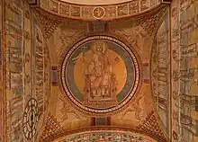 An earlier appearance of two female figures is in the now heavily restored apse mosaic of Santa Pudenziana in Rome (402-417), where two female figures behind a row of apostles hold wreaths over Saints Paul and Peter respectively, and towards an enthroned Christ. These are usually taken to represent the "Church of the Gentiles" and "Church of the Jews" - i.e. groups within the Early Christian Church which still reflected their pre-conversion backgrounds. The figures are hardly differentiated.[22] A mosaic at Santa Sabina in Rome appears to have similar figures, though the Peter and Paul are now missing and only known from an old drawing.