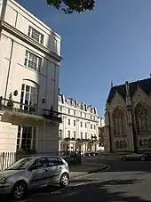 At the east end of the square is St Peter's Church. It was designed by Henry Hakewill and built between 1824 and 1827 during the first development of Eaton Square. The first church was destroyed by fire in 1836 and rebuilt by Hakewill, and again in 1987, when it was restored by the Braithwaite Partnership.[21][22] It is a Grade II* listed building, in a Greek revival style featuring a six-columned Ionic portico and a clock tower.[23][22]