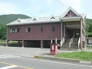 The station has one ground-level side platform serving a single bi-directional track. The station is unattended, but the station building also serves as a local public assembly hall.